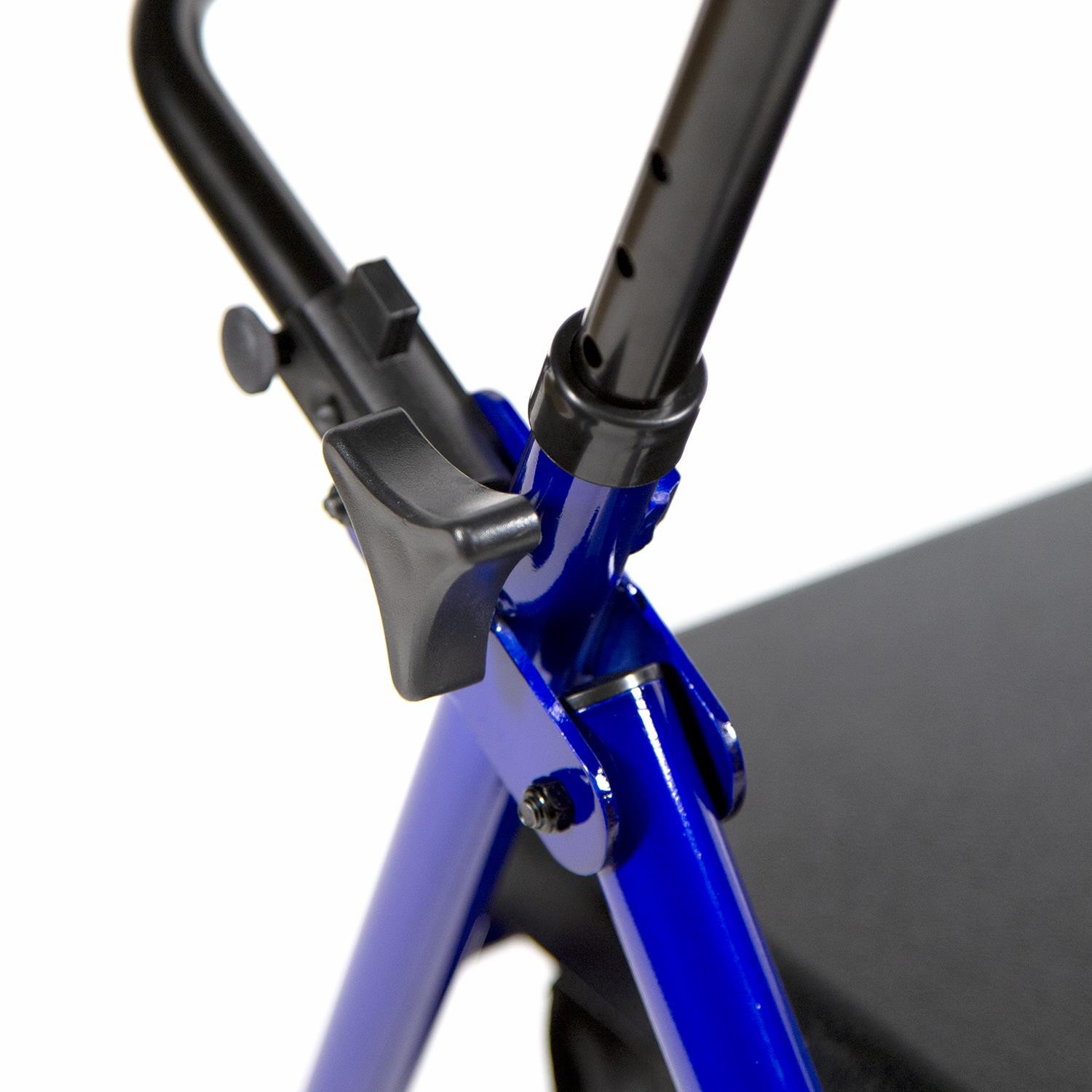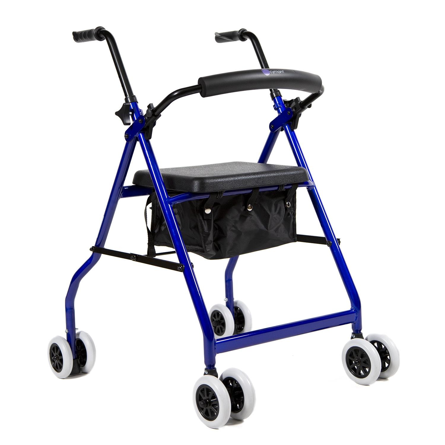 Rollator muy ligero y maniobrable fabricado en aluminio. Altura regulable con empuñadura anatómica. Freno trasero por presión. Fácil de plegar y guardar. Incorpora un asiento acolchado con respaldo y cesta portaobjetos.