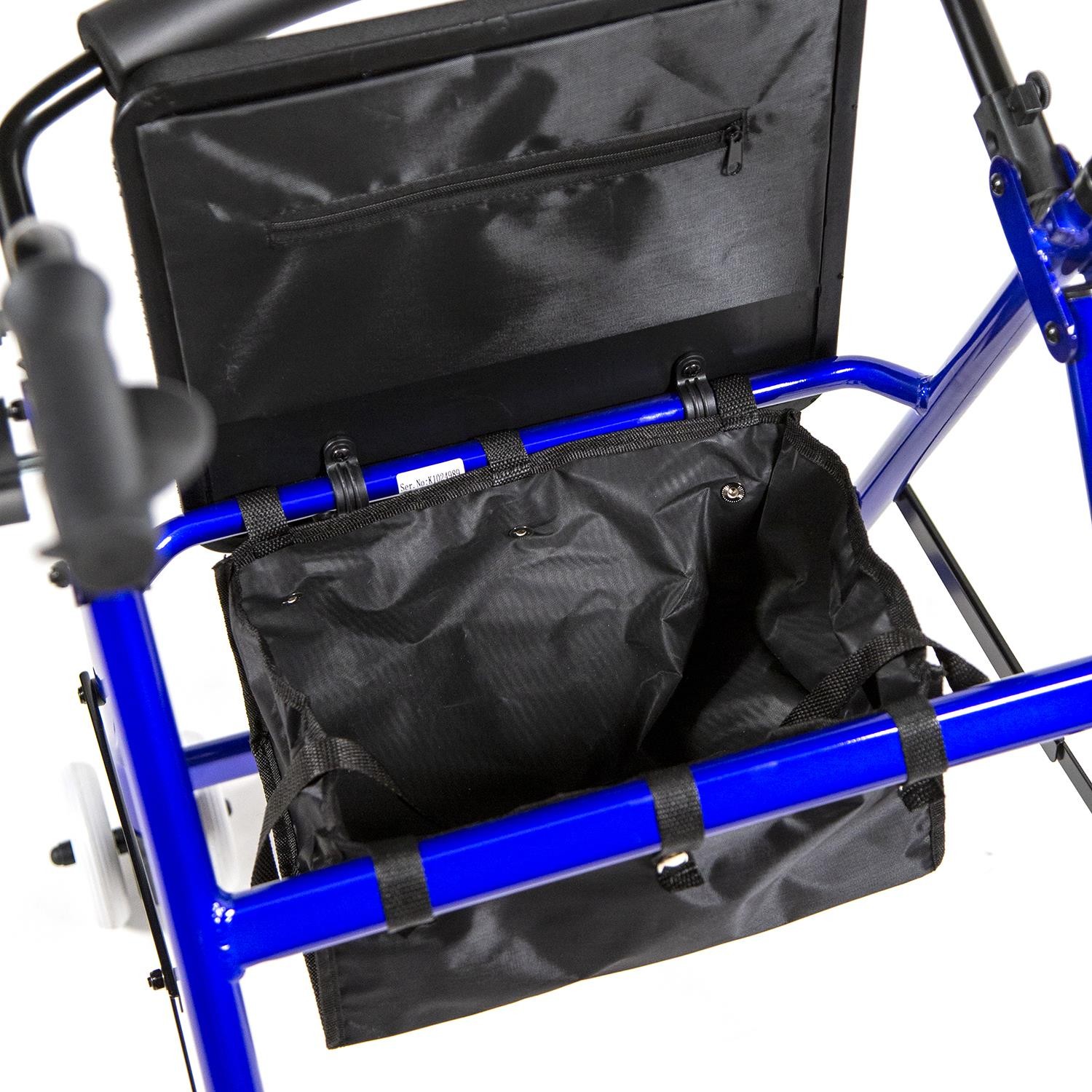 Soporta usuarios de hasta 100 kg. Freno de accionamiento mediante presión el cual facilita al usuario su utilización. Respaldo abatible que favorece el plegado. Cesta bajo el asiento que puede cargar hasta 3 kg. Incluye bolso portaobjetos con cremallera en el asiento.