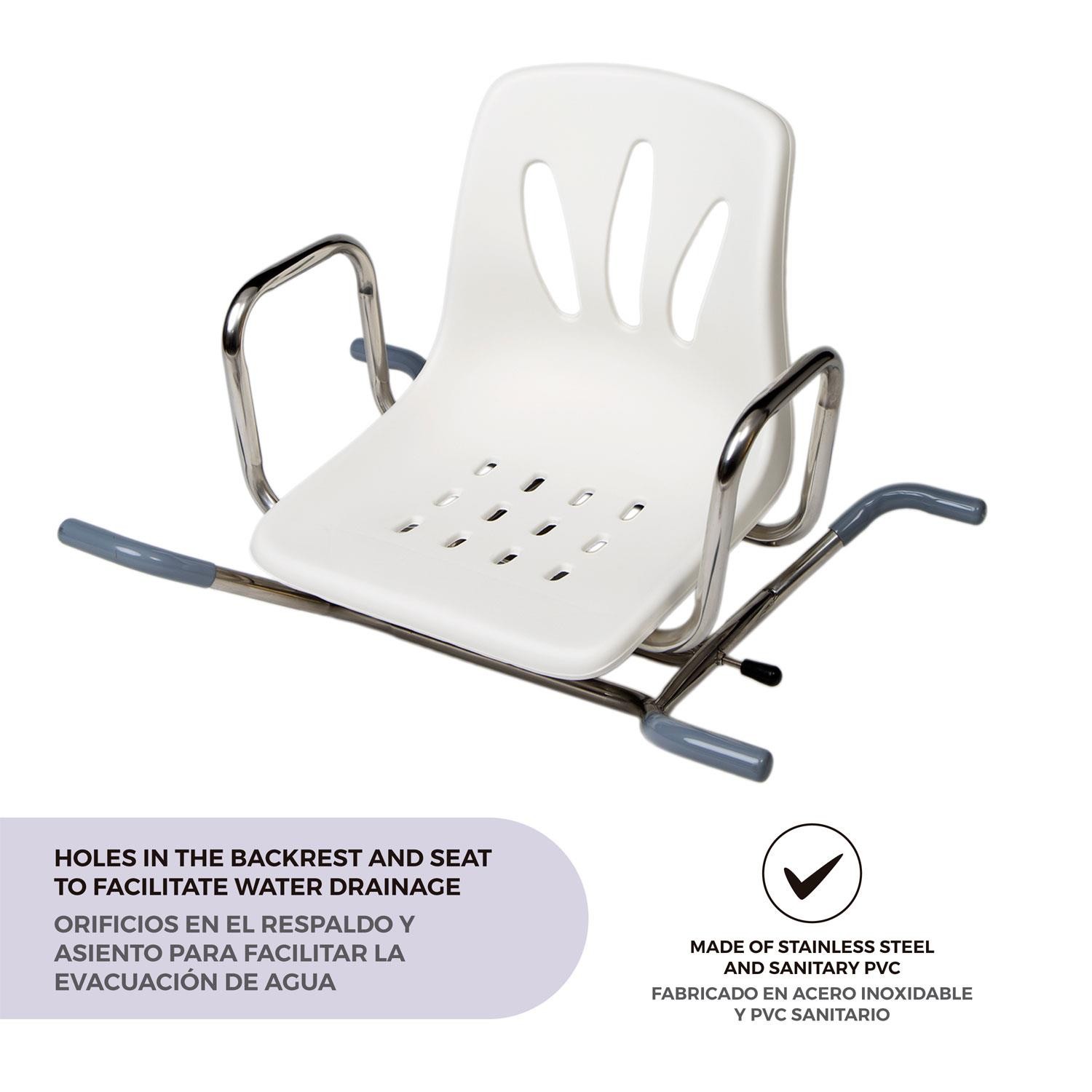 No requiere obras ni mantenimiento y se puede retirar para dejar la bañera libre. Lleva reposabrazos integrados y una palanca con 4 posiciones que puede bloquear el giro de asiento.