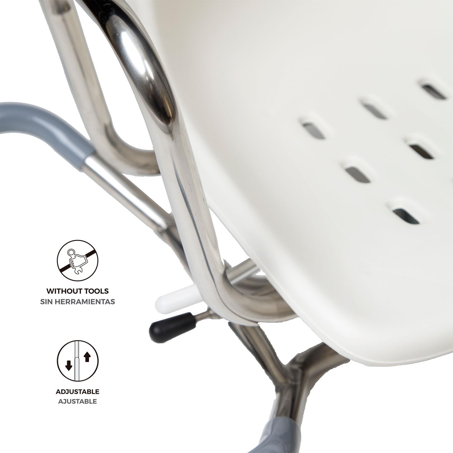 Lleva reposabrazos integrados y una palanca con 4 posiciones que puede bloquear el giro del asiento. El diseño del asiento impide deslizamientos y evacua el agua. Dos tornillos acolchados, lo aseguran en el interior de la bañera. Fabricado en acero inoxidable.
