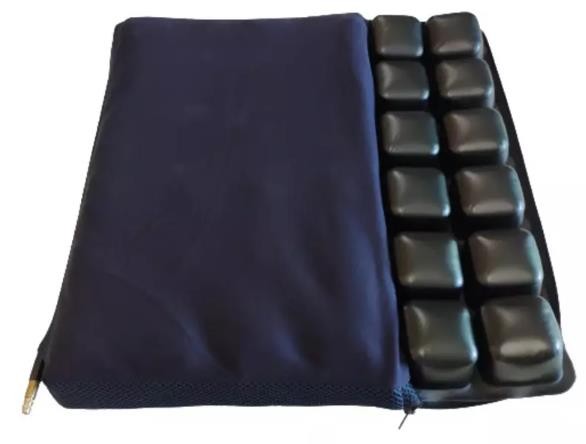 Cojín autoinfable con funda transpirable y base antideslizante, en medidas 43cm x 43cm x 5cm. Está formado por una estructura tridimensional de celdas de aire-foam. El diseño tridimensional de las celdas, suaves y confortables, se adapta a la curvatura de la cadera, moldeándose y reduciendo la presión. El espacio entre las celdas de aire permite la ventilación y la transpirabilidad, reduce la transferencia de calor entre las piernas, las caderas y el asiento, y disminuye eficazmente la temperatura.