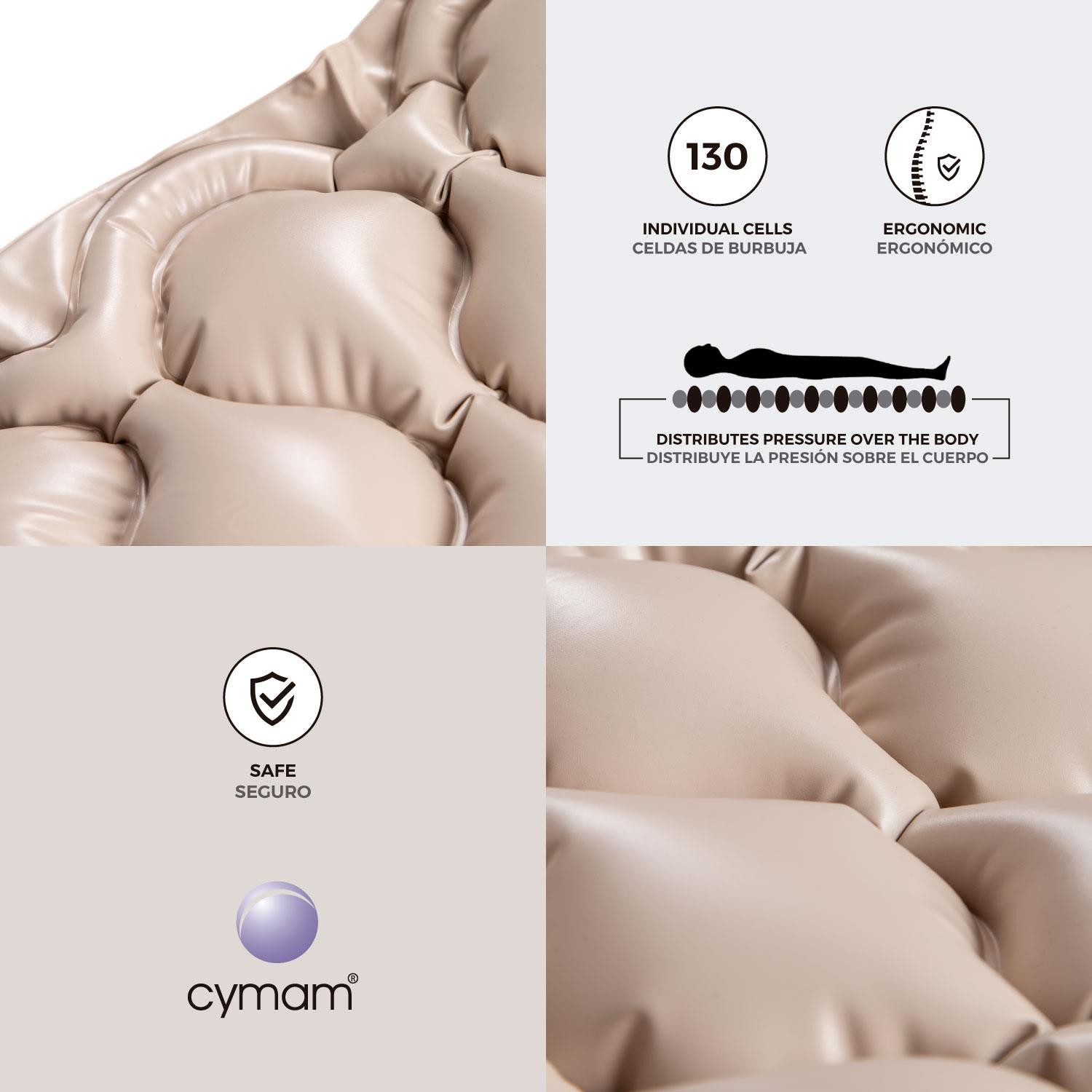 El colchón cymam antiescaras OTUR de presión alterna adecuada para prevenir las úlceras, así como para prevenir la aparición de las mismas cuando el riesgo es medio-bajo. Sus microorificios de ventilación en la zona del sacro reducen la maceración de la piel.
