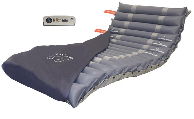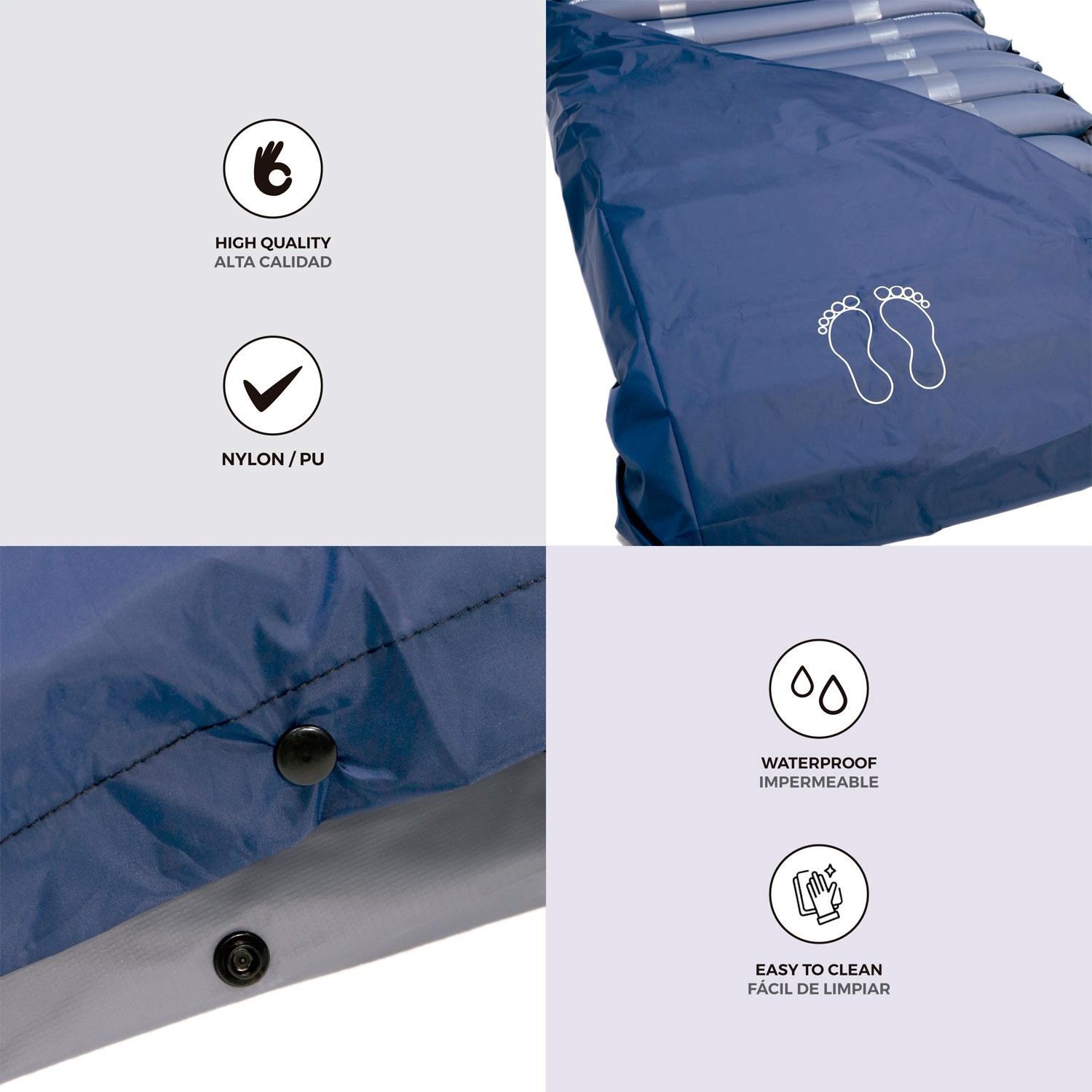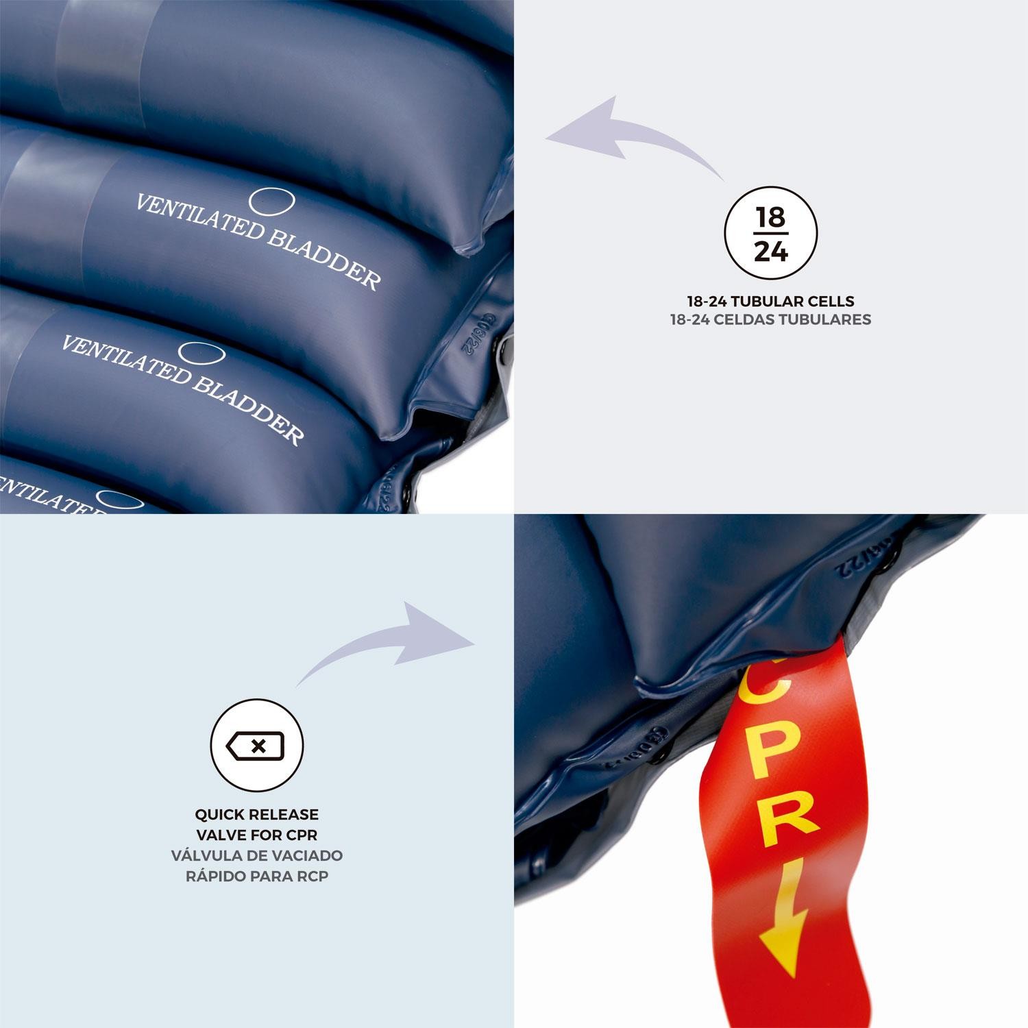 Superficie de presión alterna adecuada para tratar las úlceras por presión hasta grado II, así como para prevenir la aparición de las mismas. La presión alterna a un ritmo adecuado, evita la compresión vascular prolongada que puede causar hipoxia tisular. Así mismo, adapta el colchón al paciente y a su posición. Incluye orificios de ventilación y válvula de vaciado rápido para RCP.