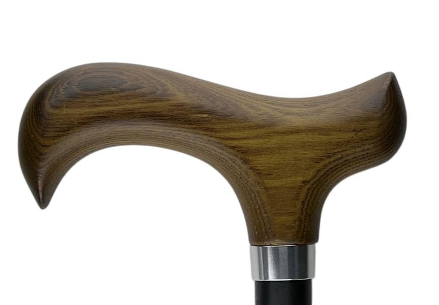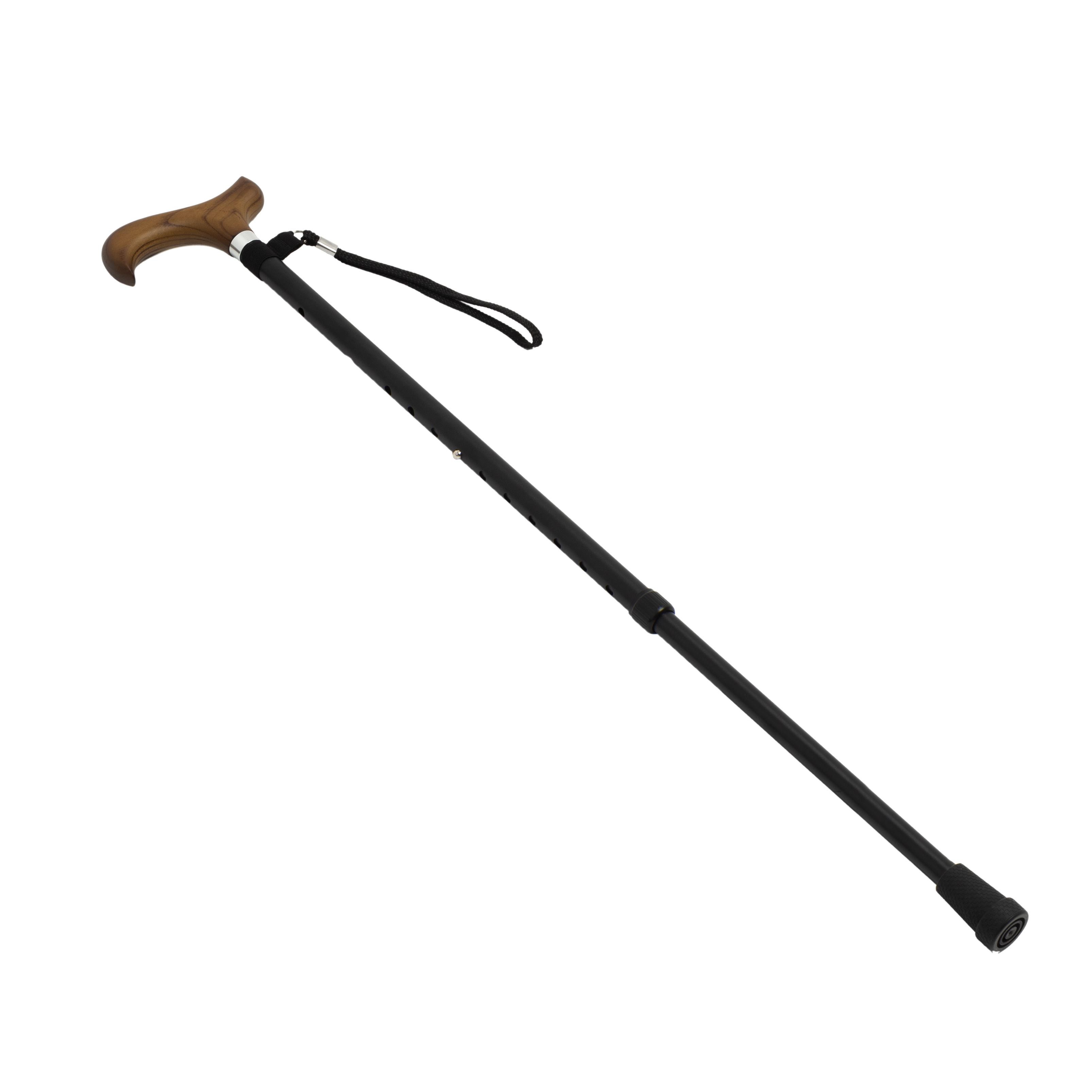 Estructura de aluminio y resistente. Altura regulable, adaptable a diferentes usuarios. Mango ergonómico de madera, apto para ambas manos. Diseño estampado elegante y moderno. Incluye cinta porta bastón, facilitando su transporte. Base con contera de goma antideslizante para mayor seguridad.