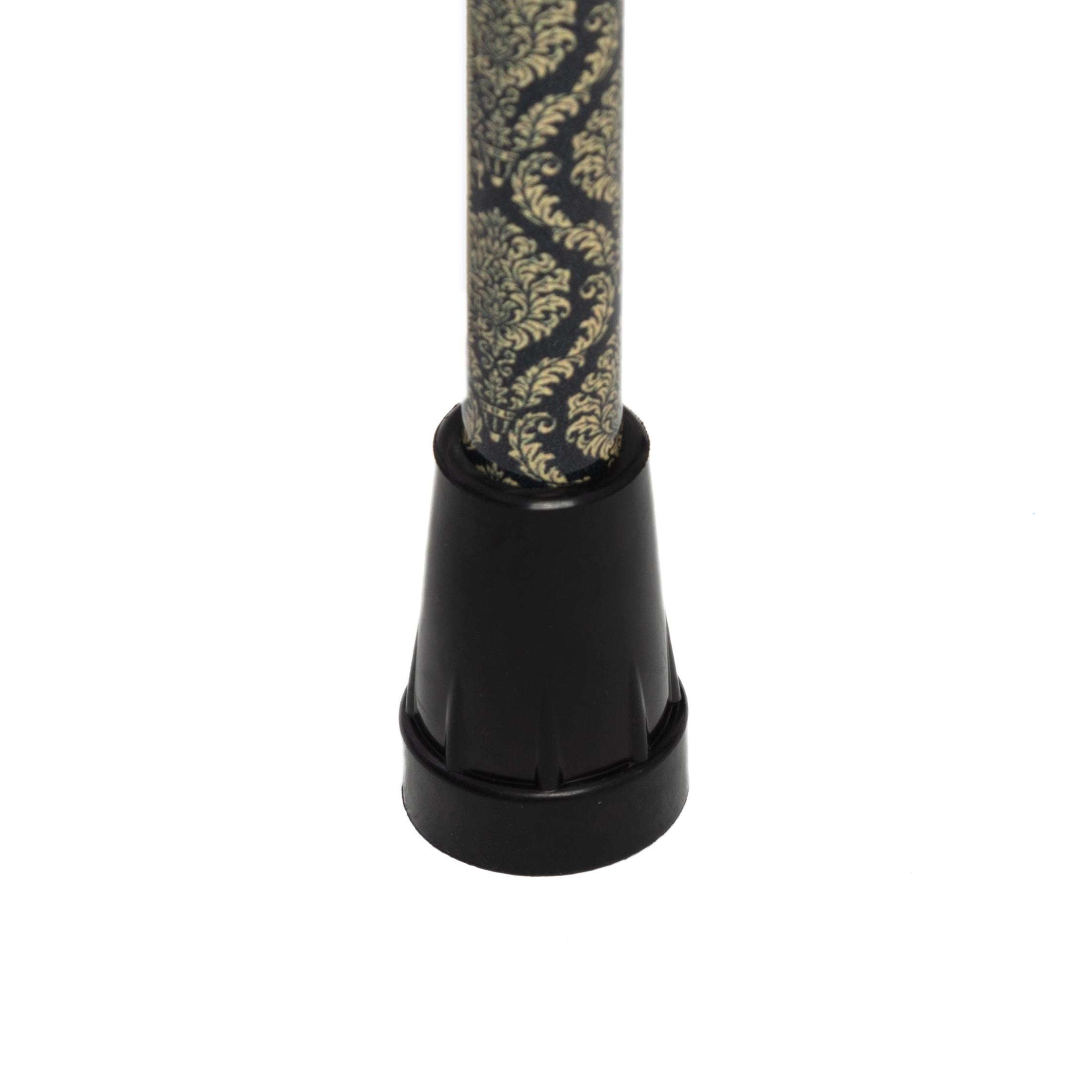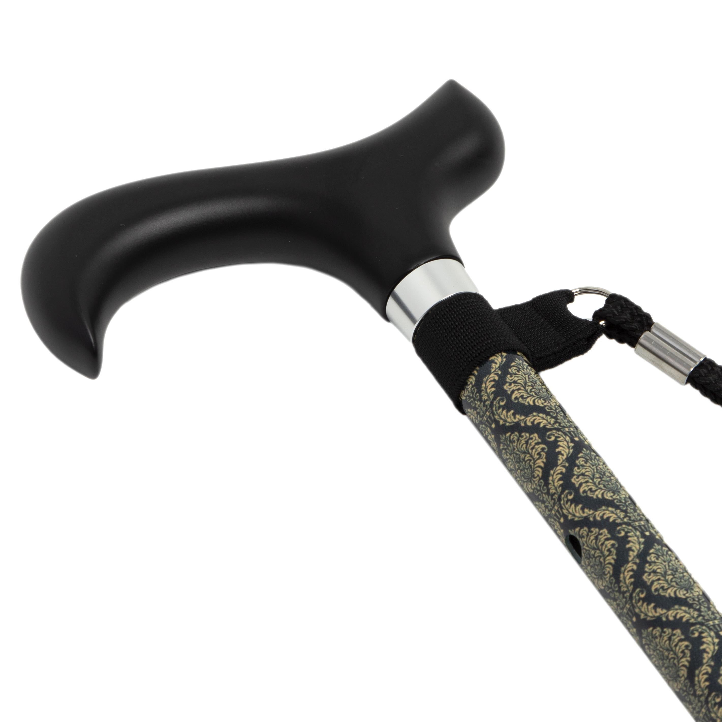 Estructura de aluminio y resistente. Altura regulable, adaptable a diferentes usuarios. Mango ergonómico de madera, apto para ambas manos. Diseño estampado elegante y moderno. Incluye cinta porta bastón, facilitando su transporte. Base con contera de goma antideslizante para mayor seguridad.