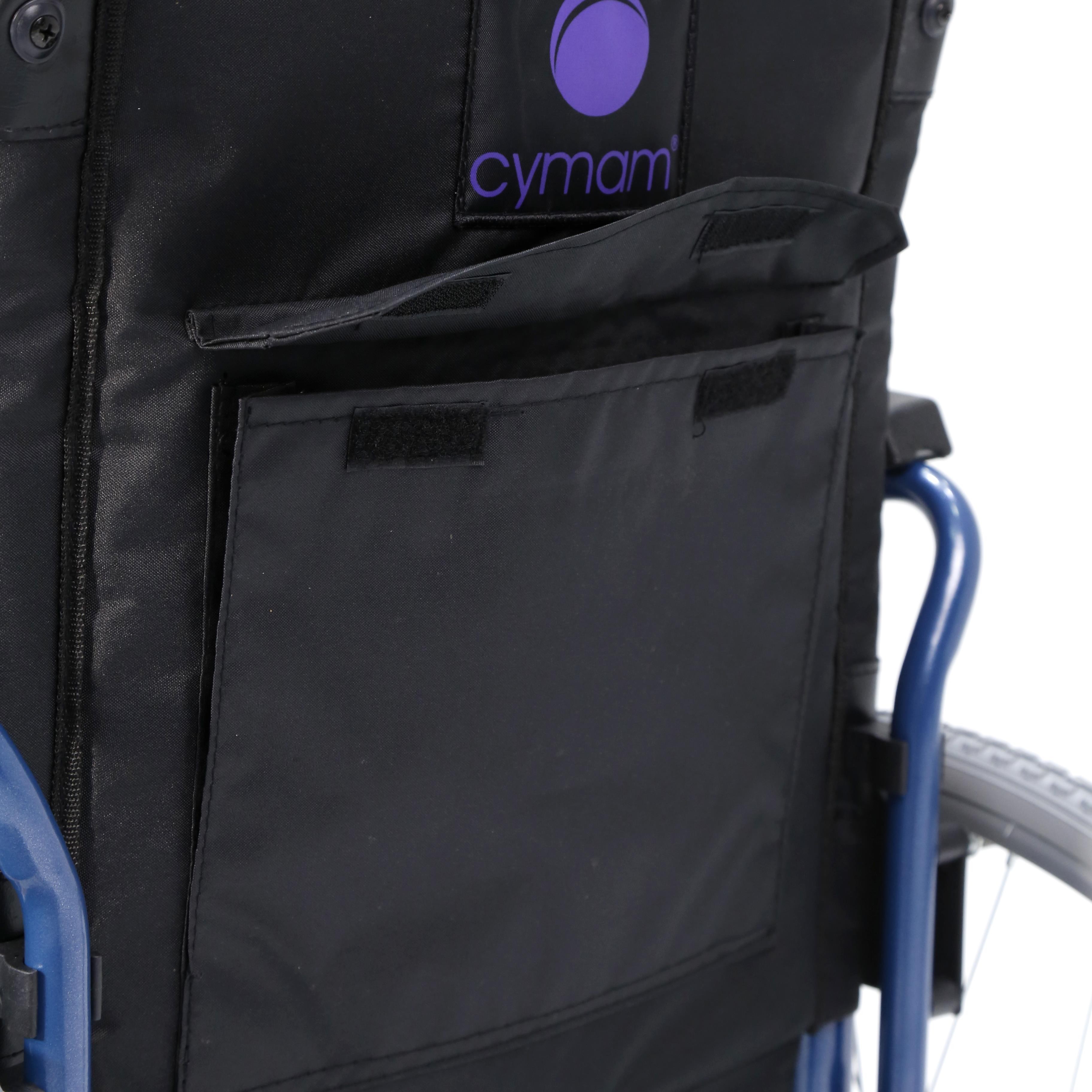 Soporta usuarios de hasta 135 kg. Reposabrazos abatilbles para facilitar transferencias. Incluye bolso portaobjetos en la parte trasera del respaldo.