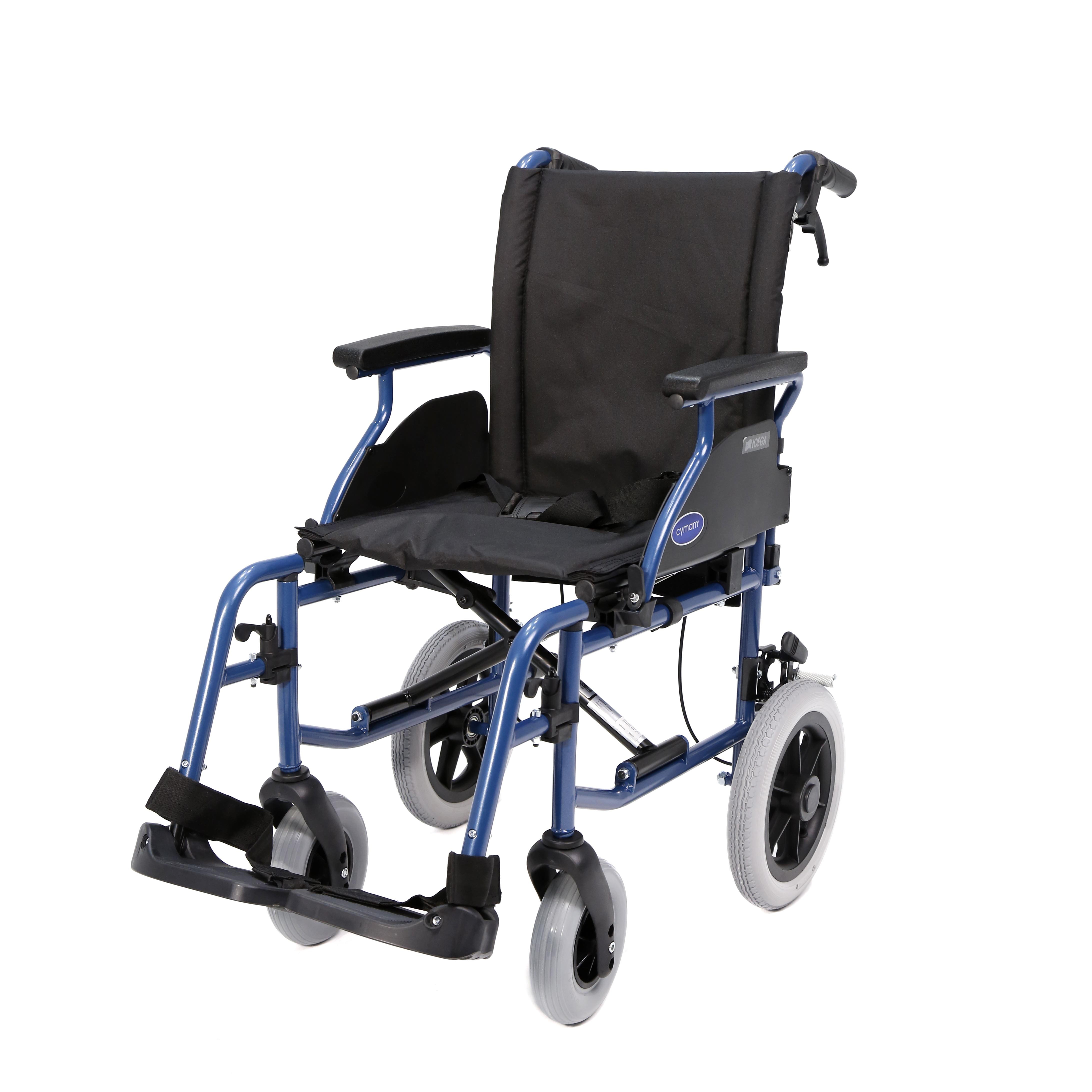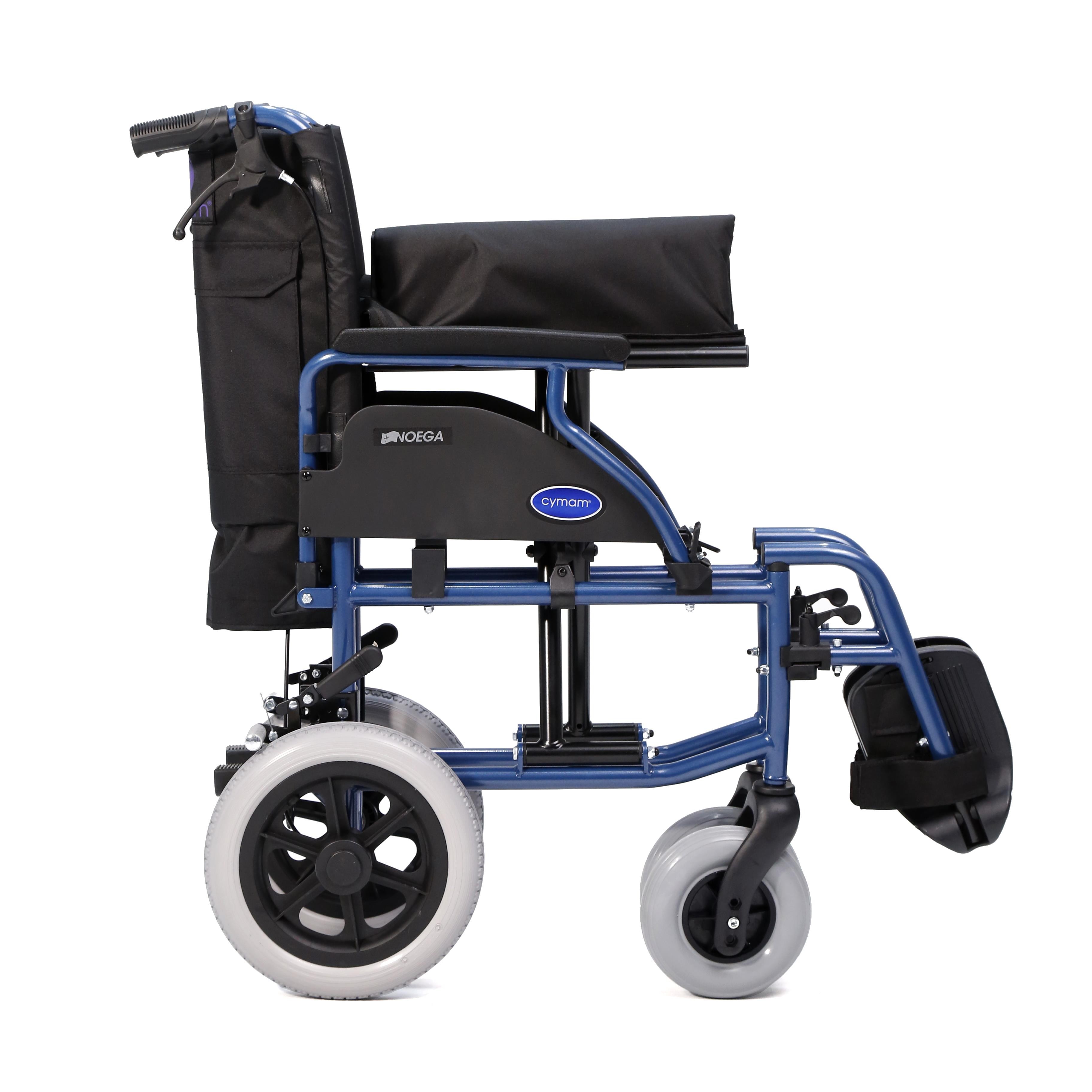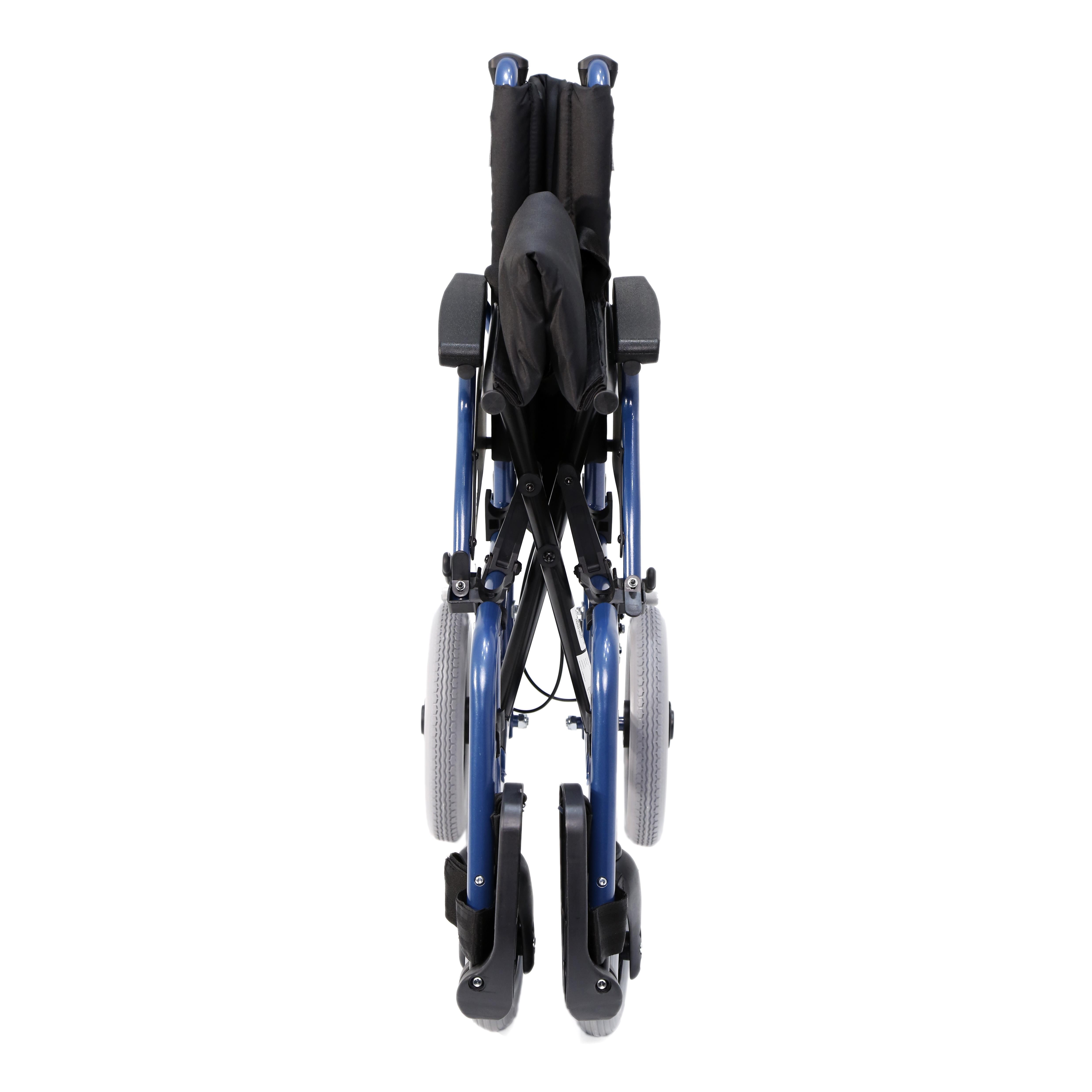 Silla de acero ligero plegable con apoyabrazos abatibles y apoyapiés extraíble y regulable en altura. Incluye un sistema de doble freno: manual y acompañante. Ruedas delanteras de PU de 200 x 50 mm. y traseras de 300 mm. de PU anti-pinchazos. Tapicería en nylon color negro. Cinturón de seguridad.
