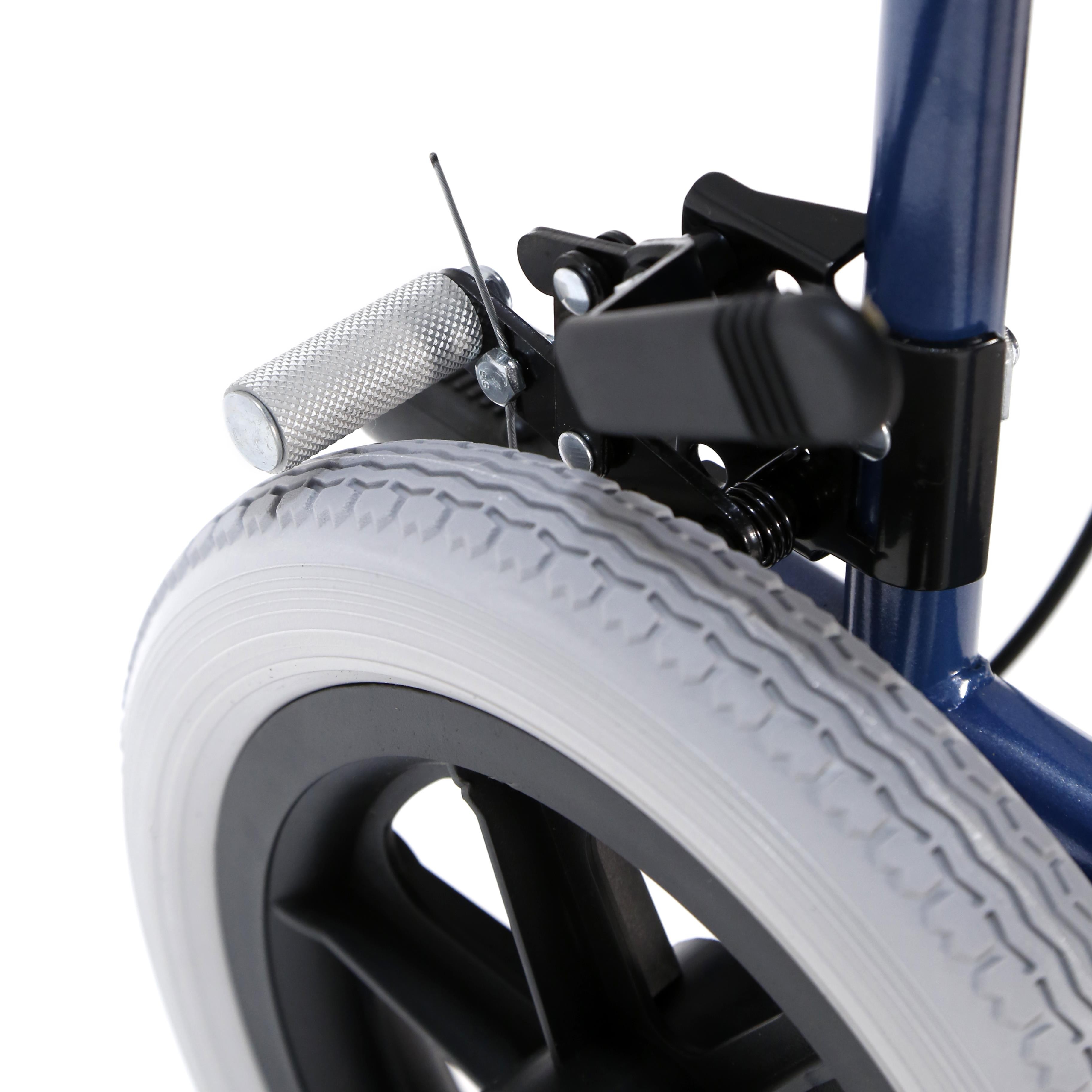 Freno de acompañante en los puños con opción a freno progresivo y de bloqueo. Soporta usuarios de hasta 135 kg. Incluye bolso portaobjetos en la parte trasea del respaldo.