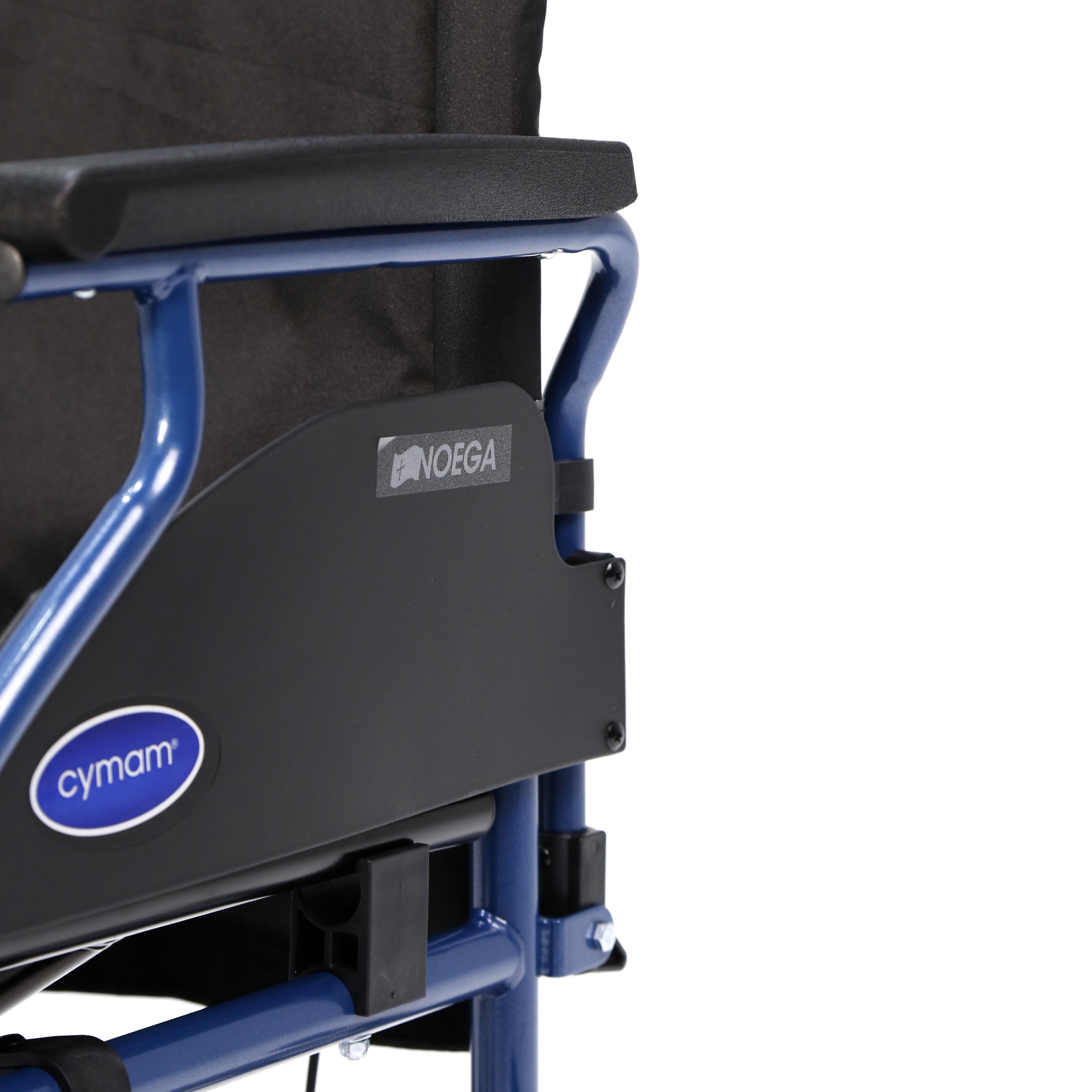 Silla de acero ligero plegable con apoyabrazos abatibles y apoyapiés extraíble y regulable en altura. Incluye un sistema de doble freno: manual y acompañante. Ruedas delanteras de PU de 200 x 50 mm. y traseras de 300 mm. de PU anti-pinchazos. Tapicería en nylon color negro. Cinturón de seguridad.