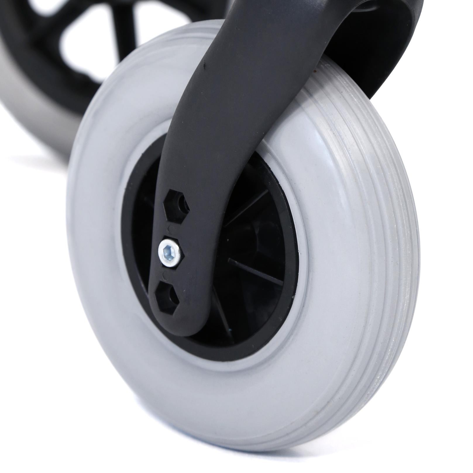 Silla de ruedas manual acompañante, de aluminio con apoyabrazos abatibles y apoyapiés extraíbles y regulables en altura. Ruedas delanteras de PU de 200 x 50 mm. y traseras de 300 mm. de PU anti-pinchazos y con Quick Release (QR). Tapicería en nylon color negro.