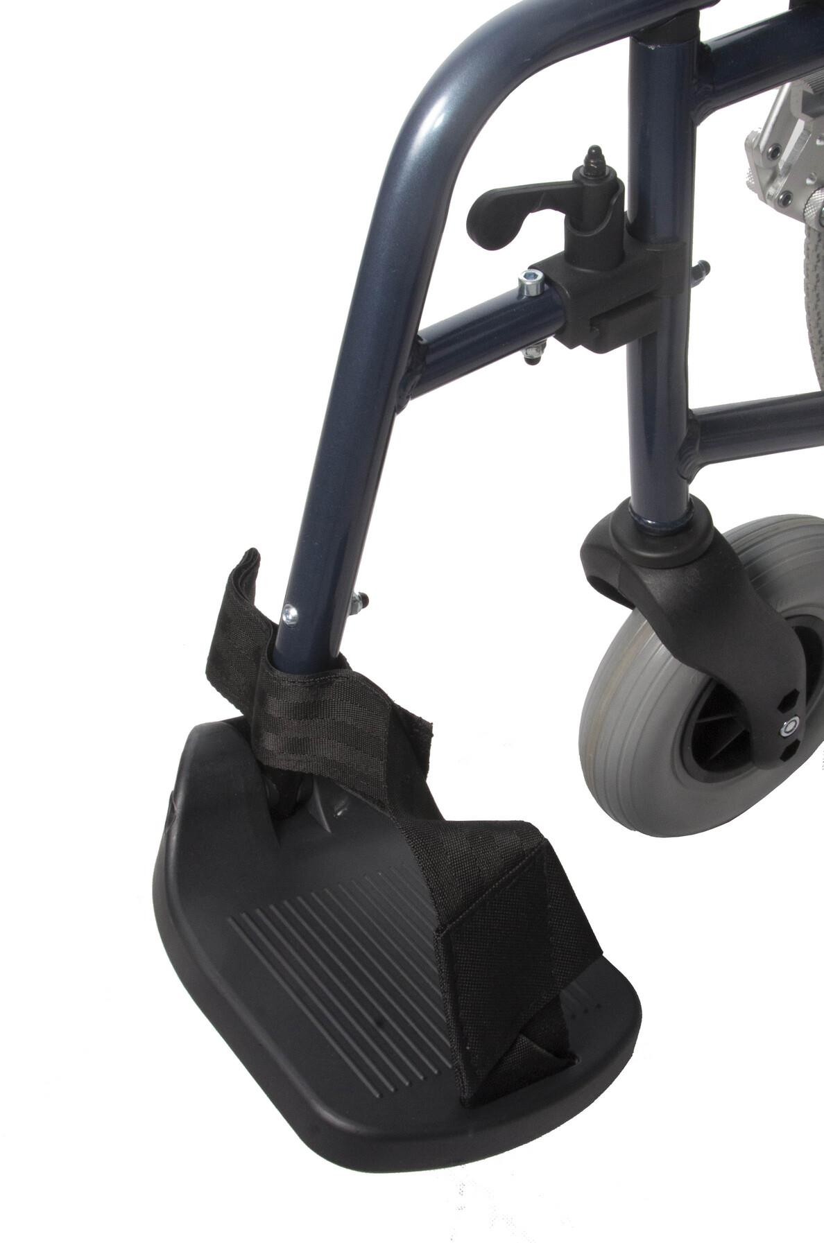 Silla de aluminio plegable con apoyabrazos abatiblesy apoyapiés extraíbles y regulables en altura. Ruedas delanteras de PU de 200x50mm. y traseras de 300mm. de PU antipinchazos con sistema de extracción rápida. Tapicería en nylon color negro.
